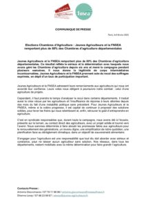 Accueil » Communiqués de presse » Elections Chambres d’Agriculture : Jeunes Agriculteurs et la FNSEA remportent plus de 80% des Chambres d’agriculture départementales » CP resultats ECA 2025