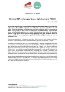 Accueil » Communiqués de presse » Elections MSA : victoire pour Jeunes Agriculteurs et la FNSEA ! » CP élections MSA 23052025