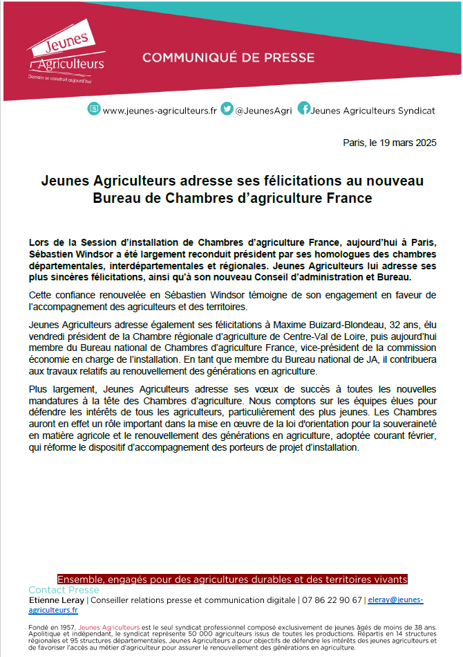 Accueil » Communiqués de presse » Jeunes Agriculteurs adresse ses félicitations au nouveau Bureau de Chambres d’agriculture France » Capture d’écran 2025-03-19 174613