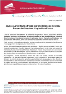 Accueil » Communiqués de presse » Jeunes Agriculteurs adresse ses félicitations au nouveau Bureau de Chambres d’agriculture France » CP Windsor 19032025