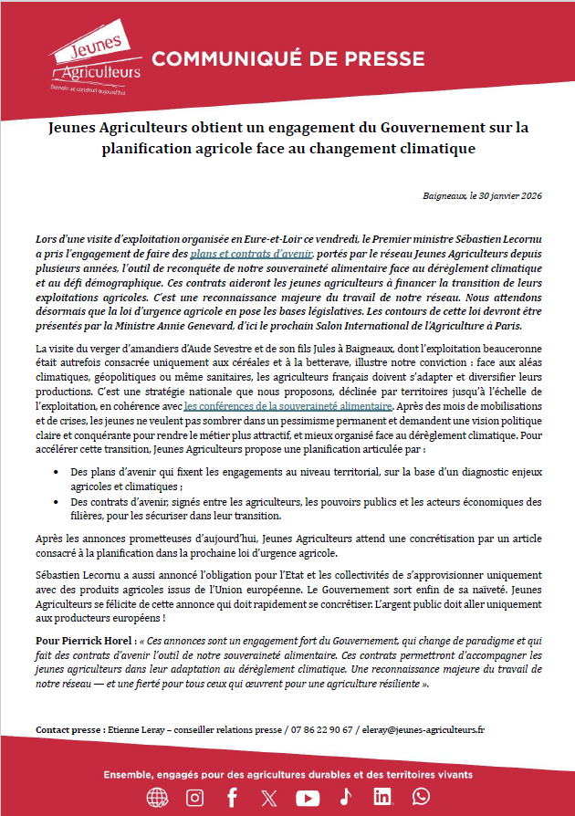 Accueil » Communiqués de presse » Jeunes Agriculteurs obtient un engagement du Gouvernement sur la planification agricole face au changement climatique » Capture d’écran 2026-01-30 190134