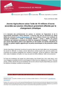 Accueil » Communiqués de presse » Jeunes Agriculteurs salue l’aide de 10 millions d’euros accordée aux jeunes viticulteurs gravement affectés par le changement climatique » CP JA viti 28022025