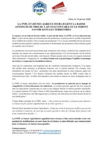 Accueil » Communiqués de presse » La FNPL et JA jugent la baisse annoncée du prix du lait inacceptable et le feront savoir dans les territoires » CP FNPLJA 15012026
