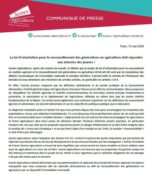 Accueil » Communiqués de presse » La loi d’orientation pour le renouvellement des générations en agriculture doit répondre aux attentes des jeunes ! » Capture d’écran 2024-05-13 172711