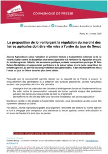 Accueil » Communiqués de presse » La proposition de loi renforçant la régulation du marché des terres agricoles doit être vite mise à l’ordre du jour du Sénat » CP PPL Dufau 12032025