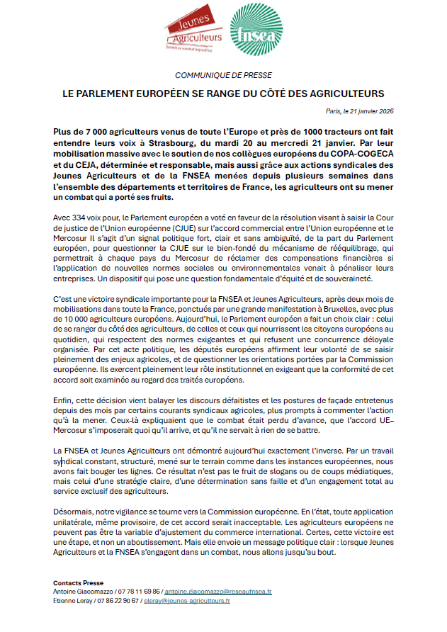 Accueil » Communiqués de presse » Le Parlement européen se range du côté des agriculteurs » Capture d’écran 2026-01-21 140459