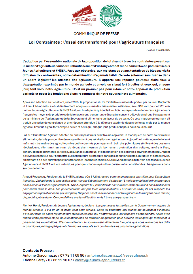 Accueil » Communiqués de presse » Loi Contraintes : l’essai est transformé pour l’agriculture française » Capture d’écran 2025-07-08 190633