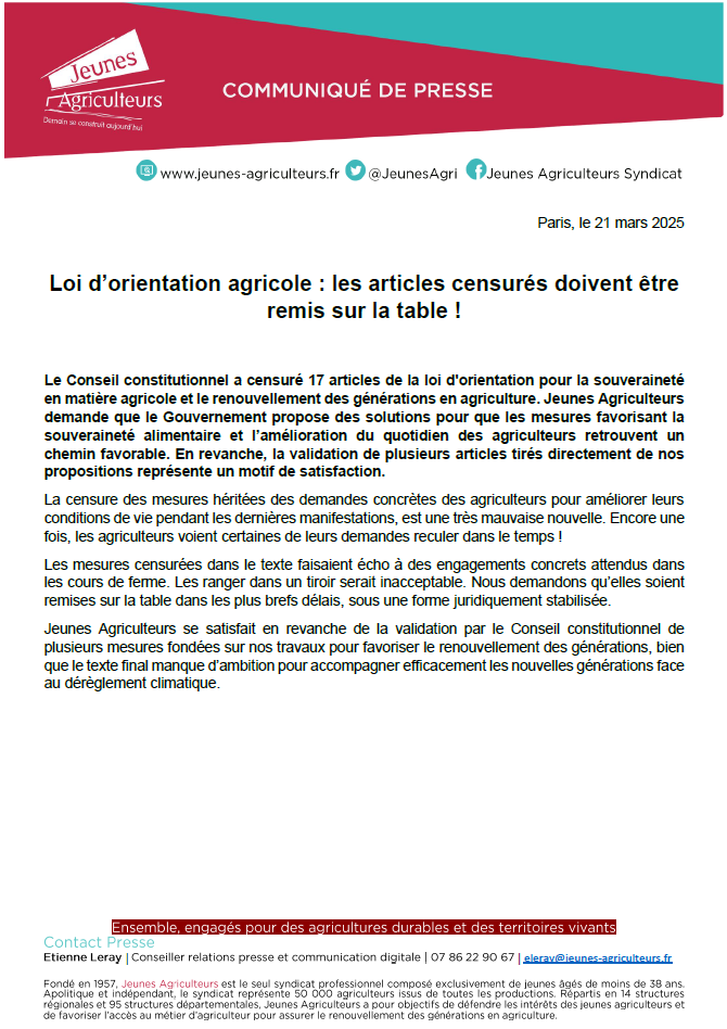 Accueil » Communiqués de presse » Loi d’orientation agricole : les articles censurés doivent être remis sur la table ! » Capture d’écran 2025-03-21 180917