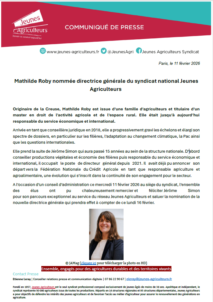 Accueil » Communiqués de presse » Mathilde Roby nommée directrice générale du syndicat national Jeunes Agriculteurs » Capture d’écran 2026-02-11 115938