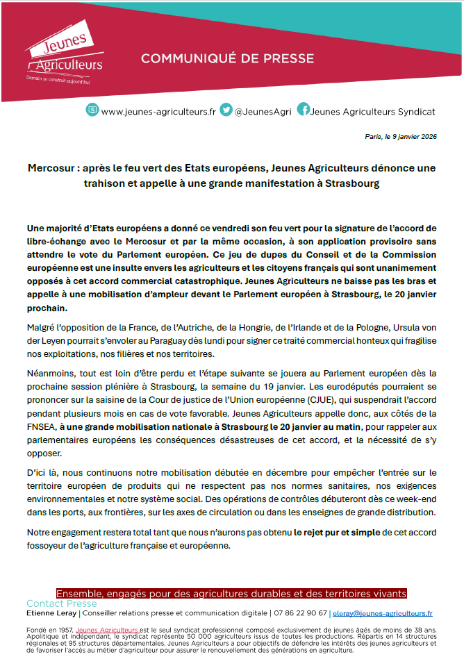Accueil » Communiqués de presse » Mercosur : après le feu vert des Etats européens, Jeunes Agriculteurs dénonce une trahison et appelle à une grande manifestation à Strasbourg » Capture d’écran 2026-01-09 151649