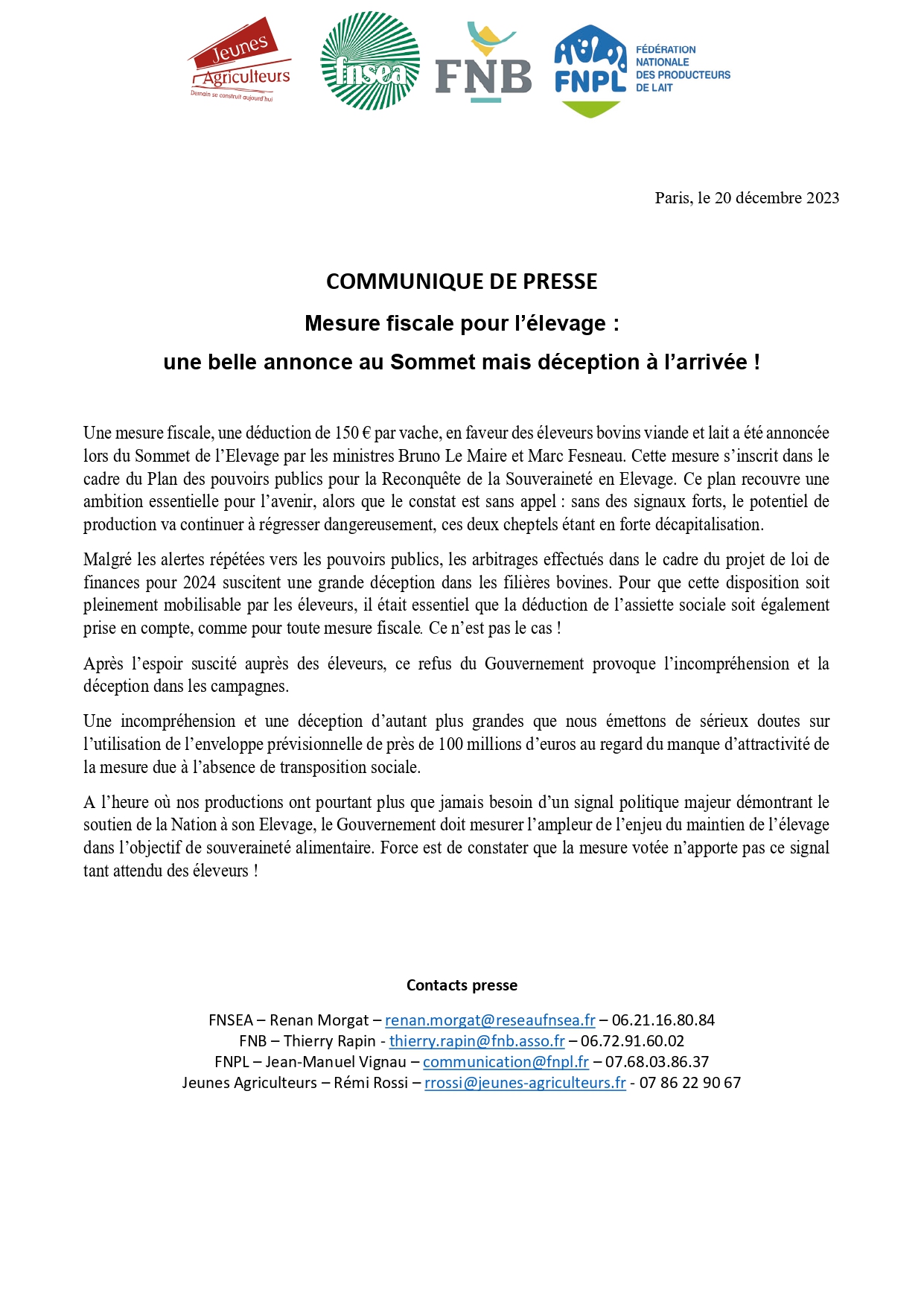 Accueil » Communiqués de presse » Mesure fiscale pour l’élevage : une belle annonce au Sommet mais déception à l’arrivée ! » CP commun sur Mesure fiscale Elevage_page-0001
