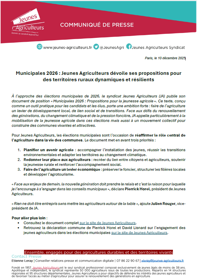 Accueil » Communiqués de presse » Municipales 2026 : Jeunes Agriculteurs dévoile ses propositions pour des territoires ruraux dynamiques et résilients » Capture d’écran 2025-12-11 150205