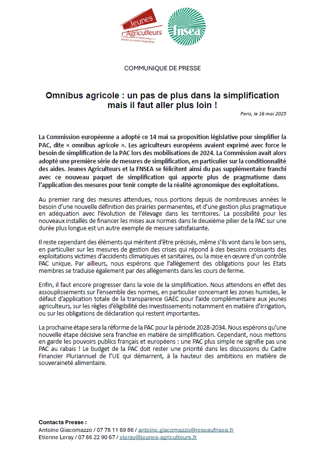 Accueil » Communiqués de presse » Omnibus agricole : un pas de plus dans la simplification mais il faut aller plus loin ! » Capture d’écran 2025-05-16 201824