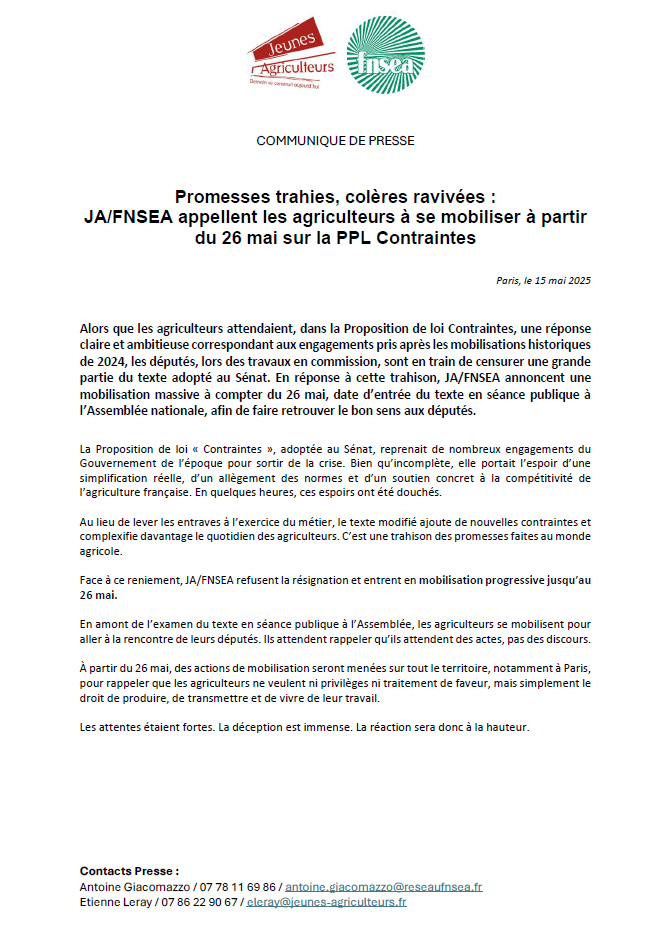 Capture d’écran 2025-05-15 193158 Publié le 15 mai 2025 PARTAGER SURX / TwitterFacebookEmailPin It Continuer la lecture... Navigation de l’article Promesses trahies, colères ravivées : JA/FNSEA appellent les agriculteurs à se mobiliser à partir du 26 mai sur la PPL Contraintes