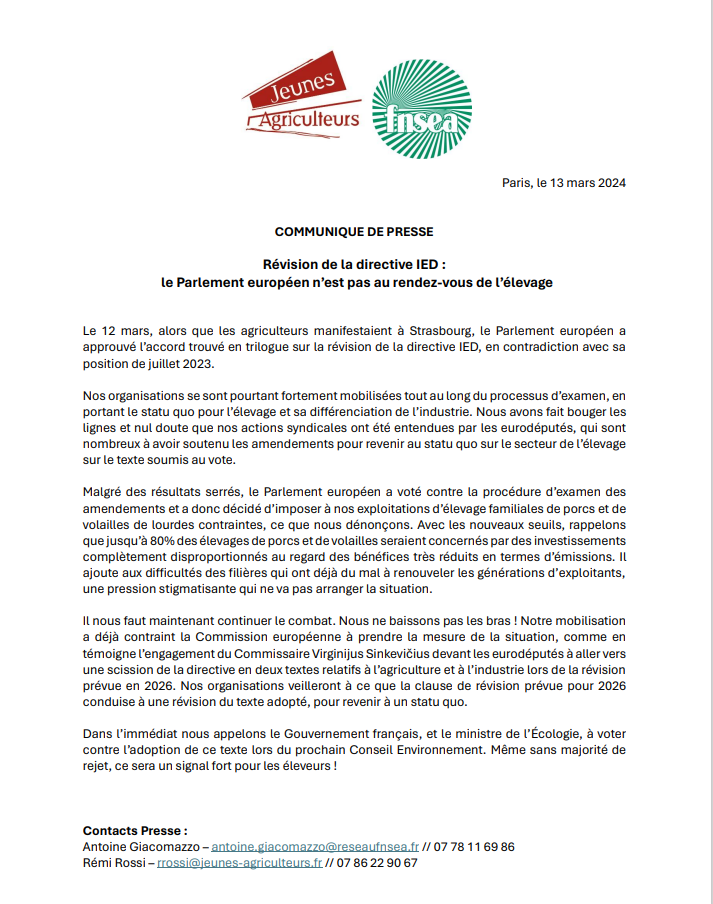 Accueil » Communiqués de presse » Révision de la directive IED : le Parlement européen n’est pas au rendez-vous de l’élevage » Capture d’écran 2024-03-13 203505