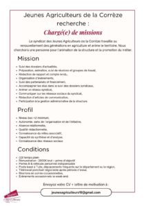 Jeunes Agriculteurs de la Corrèze recrute un(e) Chargé(e) de missions