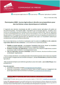 À l’approche des élections municipales de 2026, le syndicat Jeunes Agriculteurs (JA) publie son document de position « Municipales 2026 : Propositions pour la jeunesse agricole ». Ce texte, conçu comme un outil pratique pour les candidats et les élus, porte une ambition forte : faire de l’agriculture un levier de développement local, de lien social et de transitions. Face aux défis du renouvellement des générations, du changement climatique et de la pression foncière, JA appelle particulièrement à la mobilisation de la jeunesse agricole dans ces élections mais aussi à un mouvement collectif pour construire des communes vivantes et attractives.